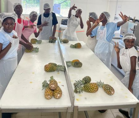 Deuxième atelier : la préparation de jus de mandarine locale, où nos lycéens ont épluché avec minutie chaque fruit pour ensuite laisser le robot terminer le travail.